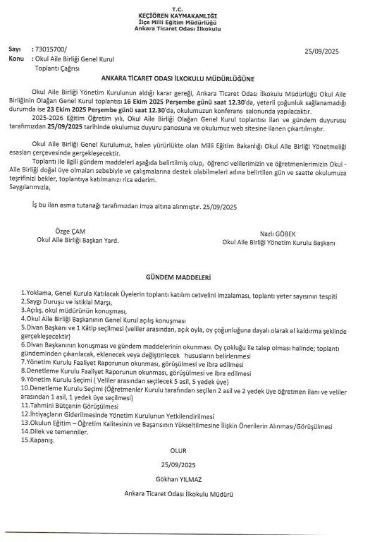 Okul Aile Birliği Yönetim Kurulunun aldığı karar gereği, Ankara Ticaret Odası İlkokulu Müdürlüğü Okul Aile Birliğinin Olağan Genel Kurul toplantısı 16 Ekim 2025 Perşembe günü saat 12.30'da, yeterli çoğunluk sağlanamadığı durumda ise 23 Ekim 2025 Perşembe günü saat 12.30'da, okulumuzun konferans salonunda yapılacaktır.